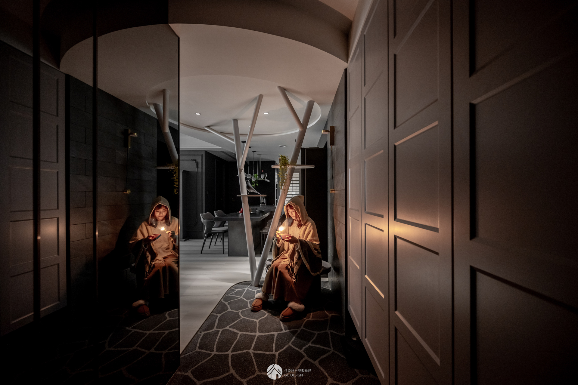 落塵區與懸空鞋櫃之間留出清潔動線、樹枝狀隔屏與石墩穿鞋椅則構成一個寓意深遠的角落。火柴形的壁燈象徵希望的微光,天花板上的圓形結構,預告即將展開的幻想旅程。隔屏更結合貓跳台與展示架機能,讓整體設計既有戲劇感又符合生活需求。