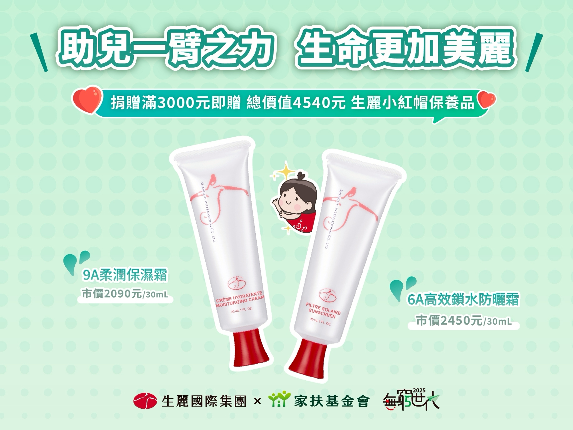 秉持「助人更美麗」的品牌精神,生麗國際集團持續以實際行動支持公益,連續5年響應家扶基金會《無窮世代》計畫。今年更攜手家扶共同推動「助兒一臂之力 生命更加美麗」募款專案,提供總價值4540元的小紅帽保養品作為滿額捐贈回饋,邀請社會大眾一同響應,讓希望在更多家庭中萌芽綻放。
