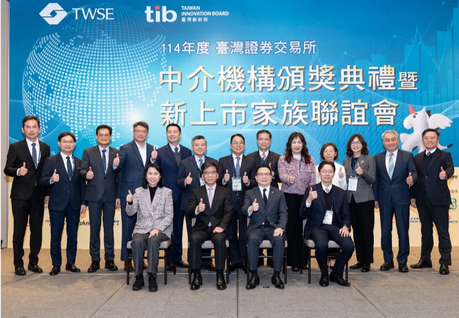 為增進新上市公司與中介機構及證交所之互動交流,並表揚證券承銷商及簽證會計師、委任律師推動國內外優質企業上市對資本市場之貢獻,證交所於115年1月8日舉辦「114年度中介機構頒獎典禮暨新上市家族聯誼會」,邀請金融監督管理委員會彭金隆主委及證券期貨局黃仲豪副局長蒞臨指導,並與主辦單位證交所林修銘董事長及李愛玲總經理共同頒獎。活動除頒發獎牌予獲獎之證券承銷商、會計師事務所及律師事務所以資勉勵外,證交所並感謝中介機構及新上市公司代表熱情參與。證交所未來將持續協助優質企業掛牌、營造更彈性的籌資環境、發展多元商品以及深化國際合作,以最積極的態度推展各項政策。