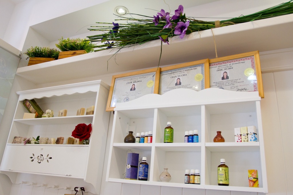境香氛 SPA 三峽北大店櫃台展示澳洲 TGA 等級精油,營造專業且溫馨的芳療空間氛圍(圖/Medick Marketing Ltd. 提供)